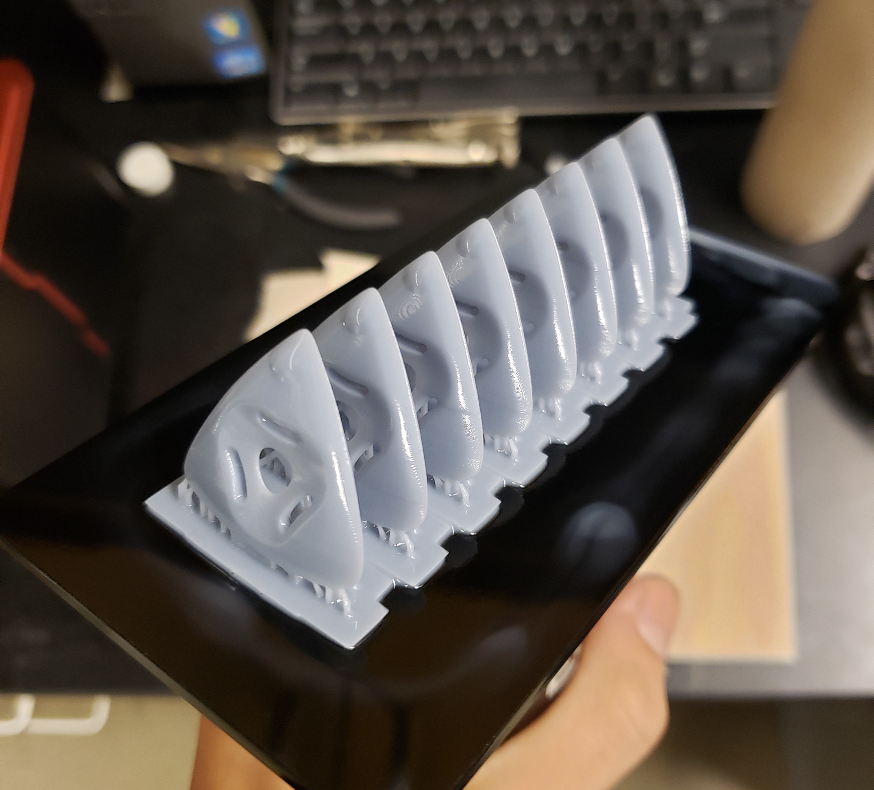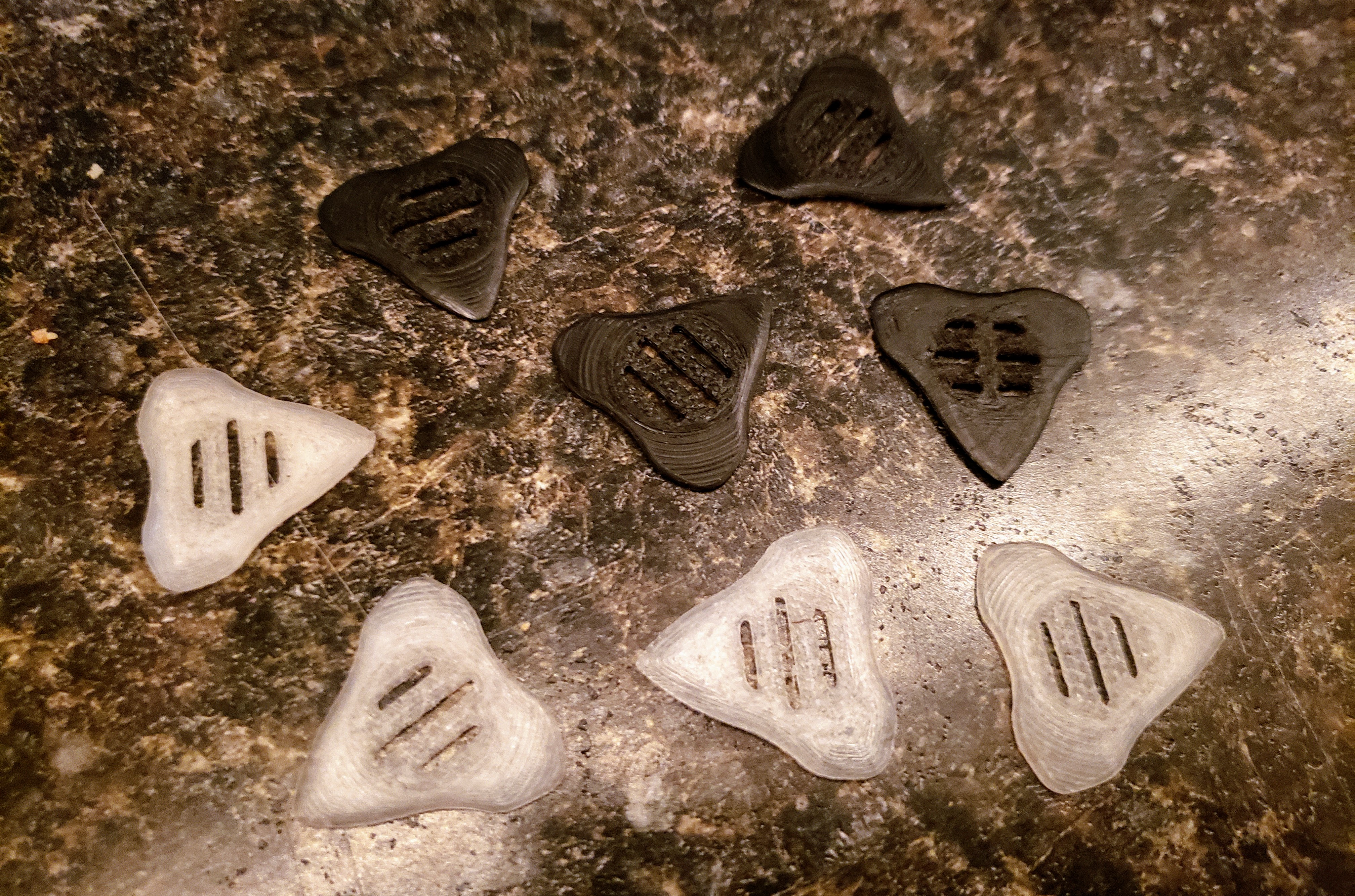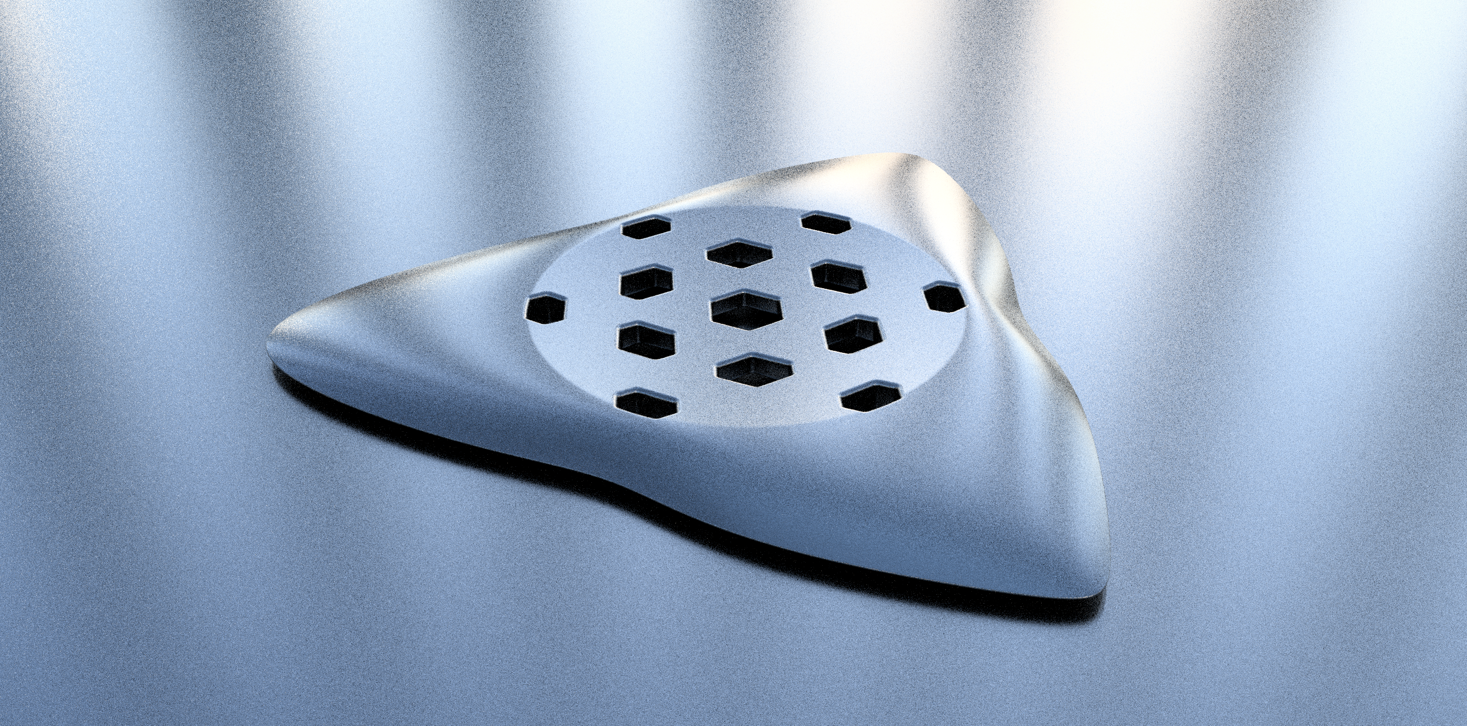 Version one is designed to be used in two orientations. One side is flat, while the other side is slightly spherical, giving the user a choice between a smooth sound and a sharp, plucky one. The central indentation cradles the fingertips and the channels therein provide space for excess moisture to wick away from the fingertips and evaporate, while the knurling ensures a secure grip at all times.